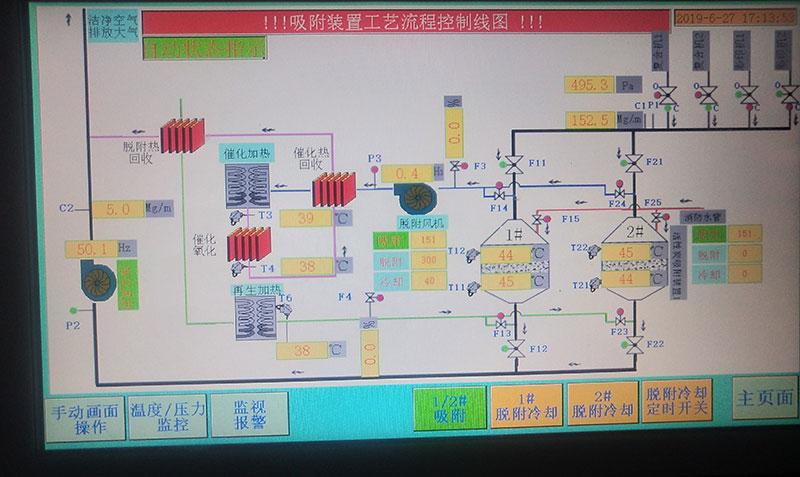 6、系統采用PLC全自動控制,車間遠程觸摸屏操控,可切換手動模式。配備VOC濃度在線監測聯動、脫附和催化燃燒溫度在線監測聯動、自動噴淋消防/氮氣保護系統聯動,一鍵啟動,安全無憂。